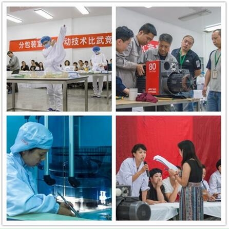 比武大賽在主持人熱情洋溢的開場語中拉開帷幕。先模擬進(jìn)行的是凍干二組年輕小伙子們的真空泵裝配比賽。每三人一組分成兩組,參賽者嫻熟地完成每一個(gè)步驟,在最短的時(shí)間里準(zhǔn)確無誤地將零部件組裝為成品。同一時(shí)間,在現(xiàn)場的另一邊,分裝人員也正熱火朝天地模擬進(jìn)行著潔凈室更衣、微生物取樣比賽,每個(gè)參賽人員嚴(yán)格按照SOP模擬進(jìn)行操作。在分賽場,正在進(jìn)行著包裝現(xiàn)場的目檢比賽。為了能準(zhǔn)確無誤差地考核目檢人員的水平,這次采用KNAPP (人機(jī)對比下人工的檢測能力測試)方法進(jìn)行考量。賽場上的選手緊張地比拼著,賽場下的現(xiàn)場觀眾也沒閑著,GMP知識及崗位操作現(xiàn)場競答場面同樣氣氛熱烈。