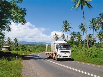 瓦努阿島是南太平洋島國斐濟(jì)第二大島。中鐵一局斐濟(jì)公司在島上修建的納布瓦魯高速公路和布扎貝高速公路解決了人們出行的“老大難”問題,有力拉動了經(jīng)濟(jì)發(fā)展,被斐濟(jì)民眾譽(yù)為“斐中兩國友好的紐帶”“共同發(fā)展致富的高速路”。圖為一輛卡車行駛在布扎貝高速公路上。(新華社記者 張永興攝)