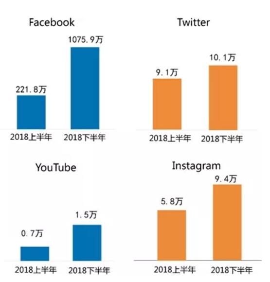 2018年以來,尤其是6月份以后,央企及其子公司新開通了幾十個境外社交媒體賬號。受此影響,與2018年上半年相比,F(xiàn)acebook平臺中央企業(yè)集團賬號的總粉絲量增長最迅猛,增長率高達385.2%,增長量為850余萬。其次,YouTube平臺央企集團賬號的總粉絲量增長率也非??捎^,為101.2%,增長量為7523個;與上半年相比,Instagram平臺央企集團賬號的粉絲量增長62.0%,增長了3.6余萬;Twitter平臺央企集團賬號總粉絲量增長率為10.7%,粉絲量比上半年增長近萬個。(見圖4)