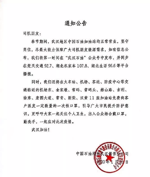 中國石油:武漢加油站正常營業(yè),天然氣供應(yīng)充足,免費派發(fā)一次性口罩