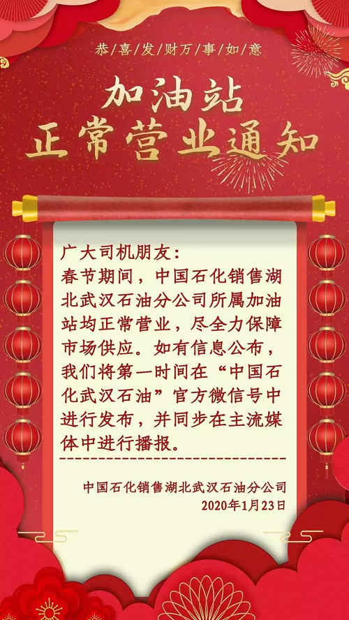 1月23日,中國石化表示,春節(jié)期間中國石化銷售湖北武漢石油分公司所屬加油站均正常營業(yè),盡全力保障市場供應(yīng)。網(wǎng)傳“斷油”消息不實,市民不必恐慌,不必提前集中到加油站加油。