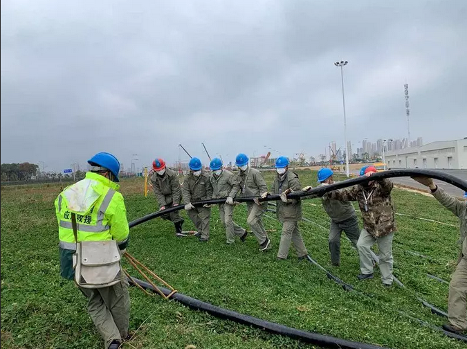 國網(wǎng)武漢供電公司員工在江夏區(qū)雷神山醫(yī)院電力配套工程現(xiàn)場施工。