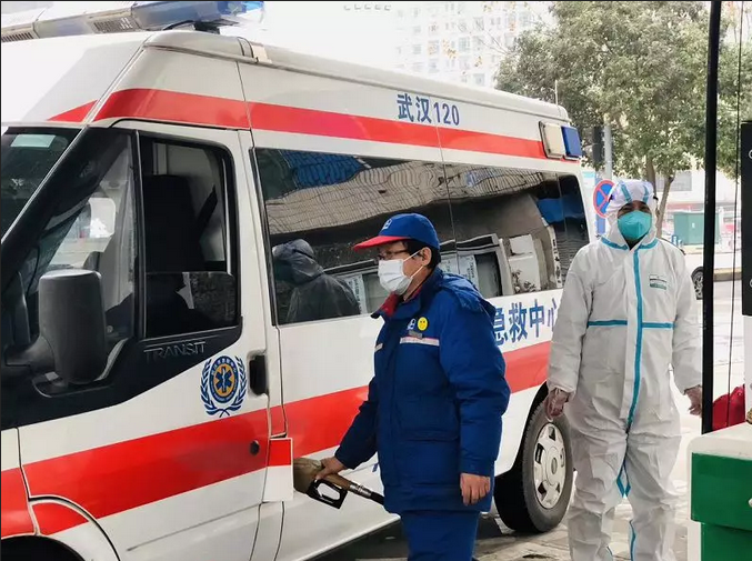 中國石化湖北武漢石油菱角湖加油站員工為救護(hù)車輛加油。