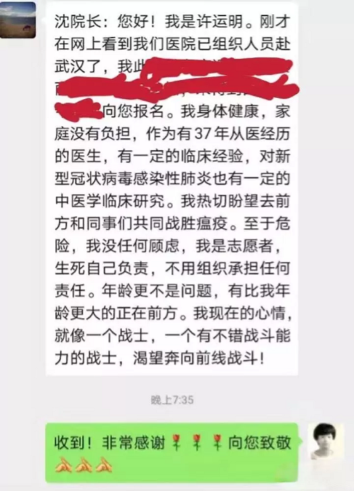 1月28日,揚州市中醫(yī)院黨委書記、院長沈雨春收到一條特別的微信:“沈院長:您好!我是許運明。我身體健康,家庭沒有負擔,作為有37年從醫(yī)經(jīng)歷的醫(yī)生,有一定的臨床經(jīng)驗,對新型冠狀病毒感染性肺炎也有一定的中醫(yī)學臨床研究。我熱切盼望去一線和同事們共同戰(zhàn)勝瘟疫。至于危險,我沒任何顧慮,我是志愿者,生死自己負責,不用組織承擔任何責任。年齡更不是問題,有比我年齡更大的正在前方。我現(xiàn)在的心情,就像一個戰(zhàn)士,一個有不錯戰(zhàn)斗能力的戰(zhàn)士,渴望奔向前線戰(zhàn)斗!”許運明同志作為天江藥業(yè)一名退休的老黨員,沖在一線,敢為人先,在這場全民戰(zhàn)“疫”中,展現(xiàn)了共產(chǎn)黨員的赤子之心。