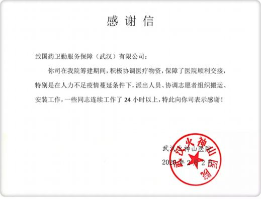 武漢火神山醫(yī)院亦對(duì)于國(guó)藥衛(wèi)勤志愿者團(tuán)隊(duì)表達(dá)了感謝!