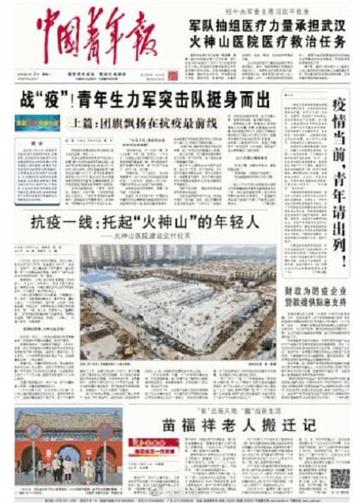 “疫情就是命令,防控就是責(zé)任”!中央企業(yè)團(tuán)工委迅速與團(tuán)中央辦公廳、宣傳部等各相關(guān)部門以及中國(guó)青年報(bào)、中國(guó)青年雜志等媒體取得聯(lián)系,建立信息報(bào)送通道及工作微信群。中國(guó)青年報(bào)武漢前方報(bào)道組在1月24日發(fā)出《中青報(bào)直擊:全國(guó)人民在吃年夜飯,他們?cè)诮ā拔錆h小湯山”》,《武漢“小湯山”醫(yī)院開(kāi)工,冒雨建設(shè)的員工90%以上是90后》等專題文章,對(duì)參與前方一線建設(shè)中的中建三局青年突擊隊(duì)進(jìn)行了特別報(bào)道,引發(fā)全社會(huì)青年的廣泛關(guān)注。