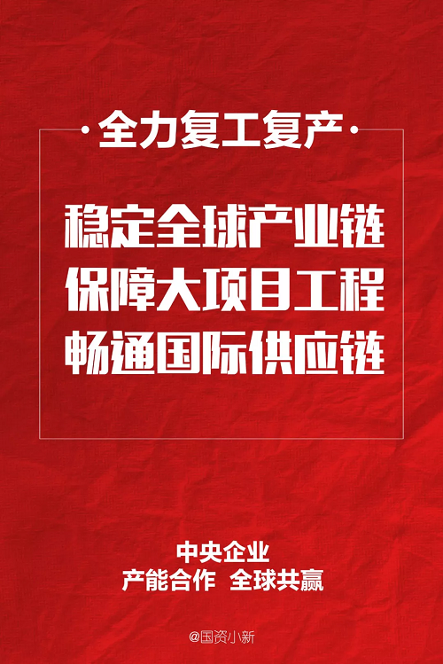國(guó)務(wù)院國(guó)資委黨委深入學(xué)習(xí)貫徹習(xí)近平總書記重要指示批示精神,堅(jiān)決貫徹落實(shí)黨中央、國(guó)務(wù)院決策部署,落實(shí)中央應(yīng)對(duì)新型冠狀病毒感染肺炎疫情工作領(lǐng)導(dǎo)小組要求,指導(dǎo)中央企業(yè)一手抓疫情防控,一手抓復(fù)工復(fù)產(chǎn),全力以赴保持生產(chǎn)經(jīng)營(yíng)穩(wěn)定運(yùn)行,努力為打贏疫情防控阻擊戰(zhàn)作出國(guó)資央企積極貢獻(xiàn)。有關(guān)中央企業(yè)全力推進(jìn)復(fù)工復(fù)產(chǎn),穩(wěn)定外需,加強(qiáng)國(guó)際產(chǎn)能合作,加快海外重點(diǎn)工程建設(shè),促進(jìn)全球產(chǎn)業(yè)鏈穩(wěn)定、供應(yīng)鏈暢通。