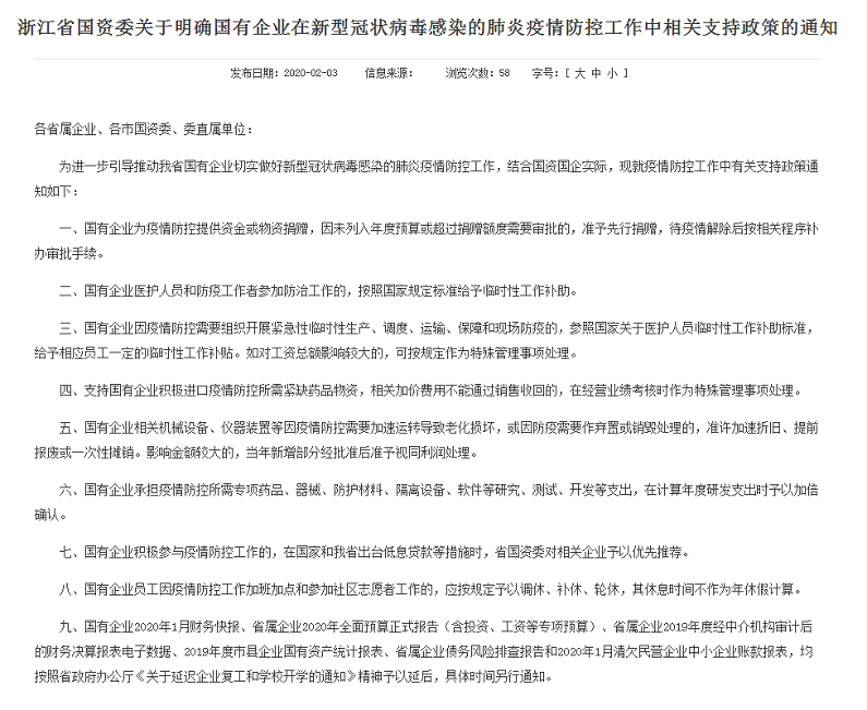 早在2月3日,為進(jìn)一步引導(dǎo)推動(dòng)企業(yè)切實(shí)做好新冠肺炎疫情防控工作,浙江省國資委印發(fā)《關(guān)于明確國有企業(yè)在新型冠狀病毒感染的肺炎疫情防控工作中相關(guān)支持政策的通知》,在經(jīng)營(yíng)業(yè)績(jī)考核、捐贈(zèng)審批、工資總額、研發(fā)支出等方面明確了九條措施,對(duì)所監(jiān)管企業(yè)積極參與疫情防控予以大力支持。