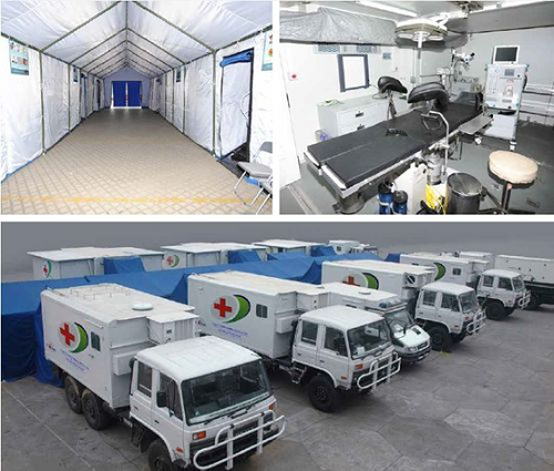 “移動醫(yī)院”裝備共涉及手術(shù)車、醫(yī)技車、通訊指揮車、水電油保障車、生活車、宿營車等近10種特種車輛,展開后就相當(dāng)于一所二級甲等綜合醫(yī)院,機(jī)動性好、模塊化組合、展開部署快速、救治功能范圍廣等,能夠完成手術(shù)、急診、急救任務(wù),同時可以保障救援人員的基本生活所需。