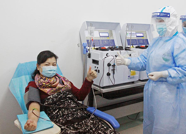 2月18日,武漢市金銀潭醫(yī)院院長張定宇的夫人程琳來到金銀潭醫(yī)院,捐獻了400毫升血漿。程琳1月19日確診新冠肺炎后在武漢市第四醫(yī)院接受治療,于1月29日康復(fù)出院。 新華社發(fā)(武漢市金銀潭醫(yī)院供圖)