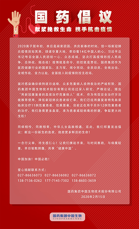 為了挽救更多鮮活生命,為患者爭取更大的生機,國藥集團中國生物向新冠肺炎康復(fù)者鄭重發(fā)出倡議: