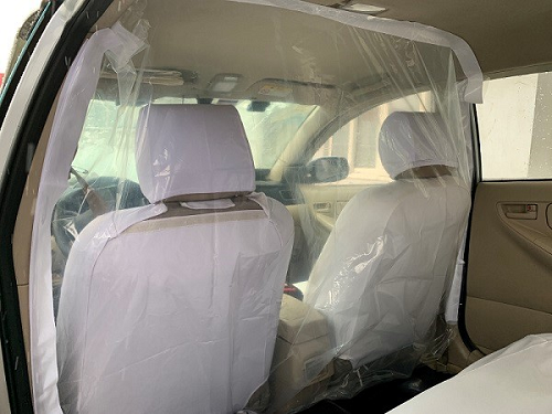 這種防護隔離膜是廠家結(jié)合天津出租車市場的車型定制設(shè)計,材料由聚氯乙烯薄膜制成,通過魔術(shù)貼使薄膜與車內(nèi)頂、前排座椅背后、后座腳墊等部位貼合連接,使車廂前后形成相對獨立的空間,能有效阻斷病毒飛沫傳播。