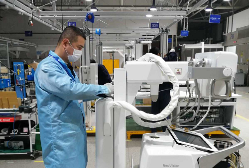 An engineer adjusts an X-ray imaging system that can be used to help fight novel coronavirus in Wuhan, at a medical equipment manufacturing company in Shenyang, Liaoning province. [Photo/Xinhua]