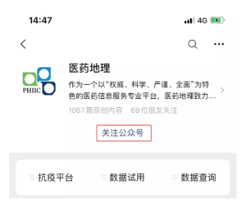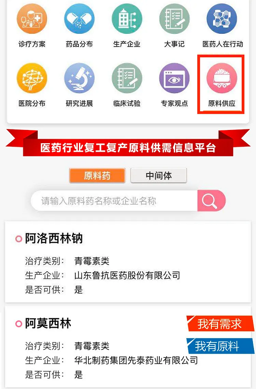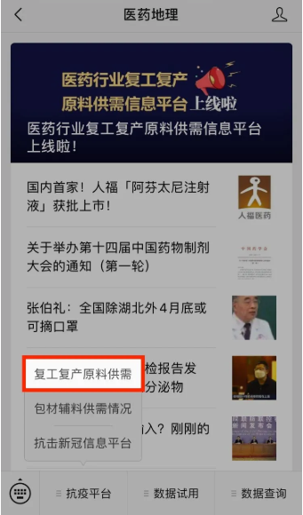 2)掃碼或搜索關(guān)注“醫(yī)藥地理”公眾號(hào),點(diǎn)擊公眾號(hào)下方菜單欄「抗疫平臺(tái)」中的「復(fù)工復(fù)產(chǎn)原料供需」進(jìn)入。