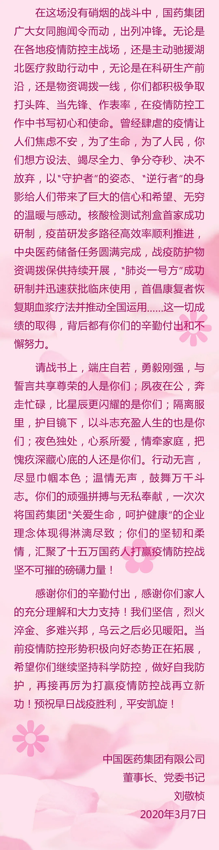 國藥集團劉敬楨董事長致信慰問抗疫一線女同事們