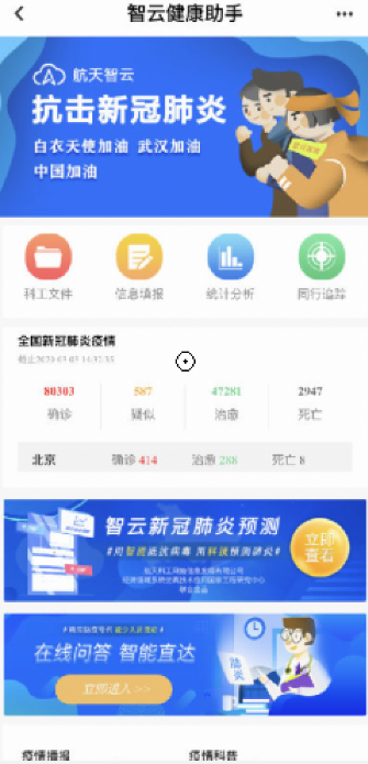 中國航天科工二院網(wǎng)信公司發(fā)揮大數(shù)據(jù)及人工智能技術優(yōu)勢,開發(fā)智云健康助手,為復工復產(chǎn)提供信息捕獲、數(shù)據(jù)支撐、輔助決策和態(tài)勢監(jiān)控等技術支撐,AI+數(shù)據(jù),云上助力疫情防控和應急管理。智云健康助手通過二維碼掃描填報,頁面簡潔、操作便捷,具備疫情信息查詢、疫情信息填報、醫(yī)療服務對接、政策文件共享等功能,其中疫情信息填報可實現(xiàn)“出行記錄、健康日報、體溫監(jiān)控、隔離情況”等常用信息一鍵提交、自動統(tǒng)計。后臺數(shù)據(jù)實時智能分析、可視化展示,加強了對企業(yè)復工復產(chǎn)期間的趨勢分析和疫情預警,讓數(shù)據(jù)的變化實時顯示,快速精準“阻擊”疫情蔓延,為抗擊疫情、復工復產(chǎn)提供智能分析。目前,智云健康助手已在北京市豐臺區(qū)委區(qū)政府等政府機構,二院、湖南航天等多家單位推廣應用。