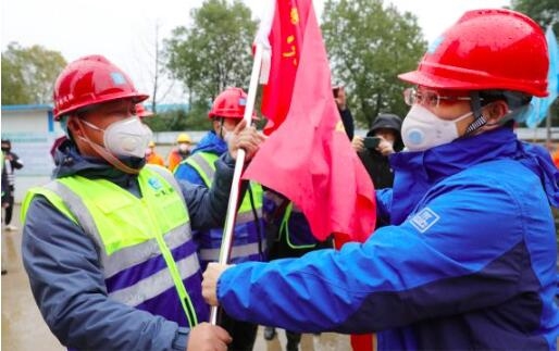 1月25日大年初一,陳衛(wèi)國(右)為火神山醫(yī)院項目黨員突擊隊授旗。