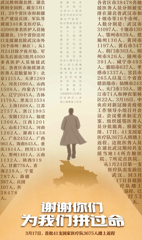隨著疫情防控形勢的逐漸好轉(zhuǎn),完成醫(yī)療救助任務(wù)的來自全國42322名醫(yī)護(hù)人員,將陸續(xù)分批離開武漢。今天,3月17日,41支國家醫(yī)療隊(duì)3675人踏上返程。
