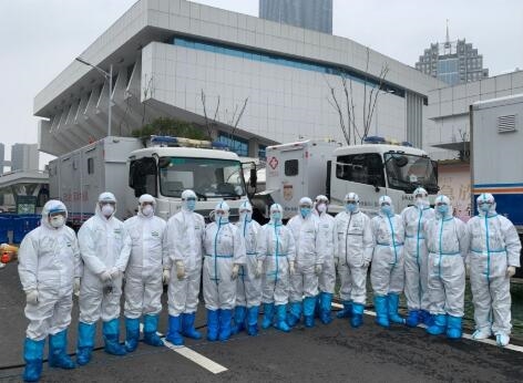 來自中國航天科工的“移動醫(yī)院”裝備保障隊(duì)員和上海復(fù)旦大學(xué)附屬華山醫(yī)院醫(yī)護(hù)人員在武昌方艙醫(yī)院前合影。