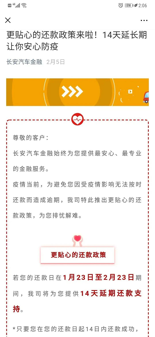 兵器裝備集團(tuán)所屬長安汽車金融緊急制定《關(guān)于為受新型冠狀病毒疫情影響客戶提供還款延期支持方案》,成為在同業(yè)中率先提供延期還款支持服務(wù)的公司。