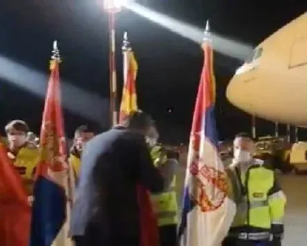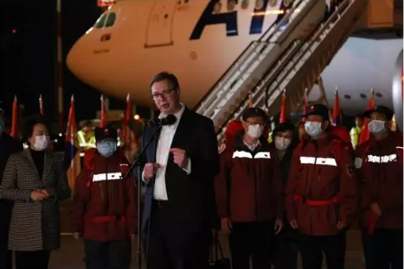 當(dāng)?shù)貢r間3月21日晚,塞爾維亞貝爾格萊德尼古拉·特斯拉機場燈火通明,塞爾維亞總統(tǒng)武契奇率領(lǐng)豪華接機陣容,同中國駐塞大使陳波一起,迎接中國政府萬里馳援鐵桿朋友的醫(yī)療隊和防疫物資。