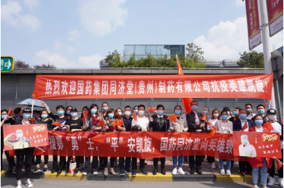 白衣執(zhí)甲,逆行出征。春暖花開,平安歸來。3月26日下午,最后一批馳援湖北的貴州醫(yī)療隊返程,387名隊員帶著鄂州人民的不舍與感激,搭乘專機抵達(dá)貴陽龍洞堡機場,迎來了家鄉(xiāng)同胞的熱情歡迎和深深敬意。凱旋的隊伍里有我們同濟堂制藥的兩位英雄——覃方勇、付守平。國藥集團同濟堂制藥黨委書記、總經(jīng)理朱鶴率公司經(jīng)營班子成員、各黨支部代表、員工代表前往機場迎接。