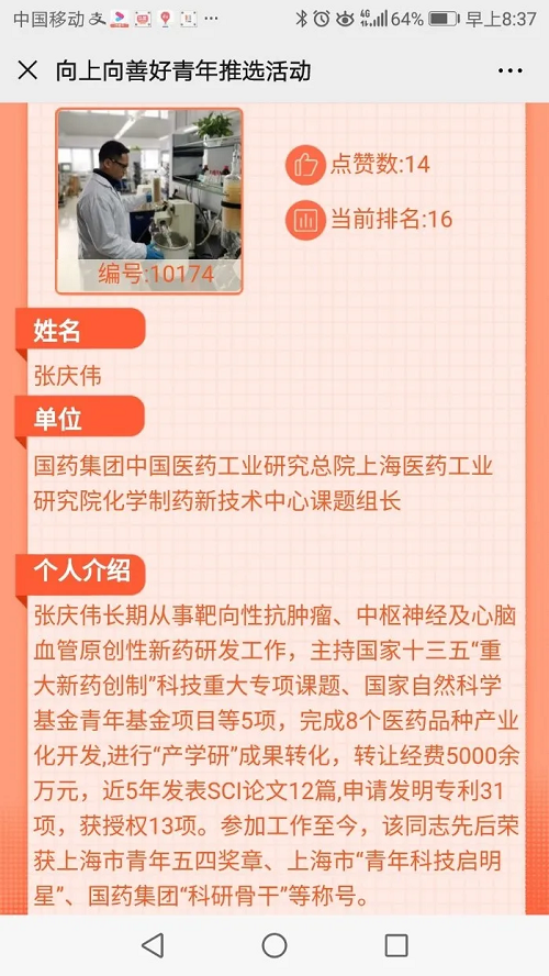 請行動起來,投出您的一票,為您身邊的好青年國藥醫(yī)工總院張慶偉加油!