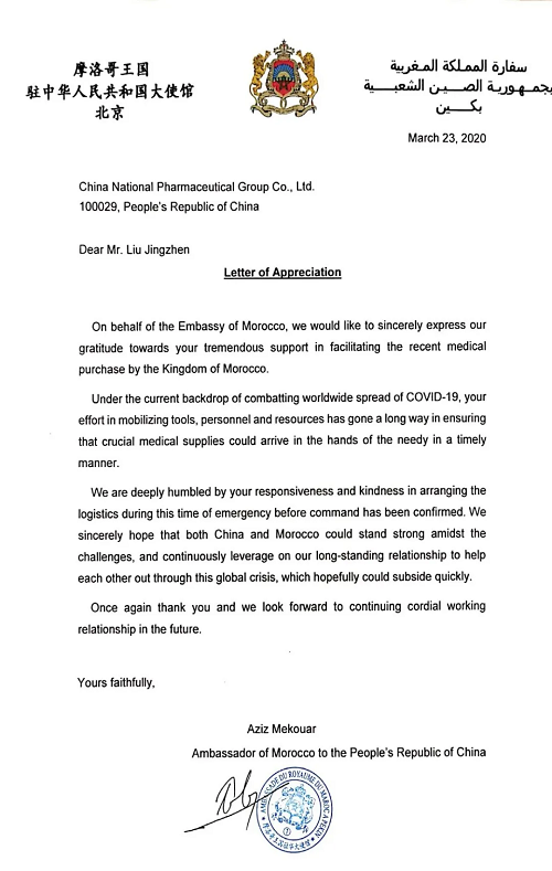 3月26日晚,國藥嘉遠(yuǎn)收到了一封摩洛哥大使對(duì)國藥集團(tuán)董事長(zhǎng)劉敬禎的感謝信,感謝國藥在防疫物資供應(yīng)方面對(duì)摩洛哥提供的巨大幫助。這封信的背后,是國藥國際所屬國藥嘉遠(yuǎn)員工72小時(shí)廢寢忘食的奮戰(zhàn)。