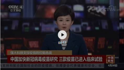 4月30日,CCTV4中國新聞系列報道《強大科技支撐疫情防控阻擊戰(zhàn)》隆重介紹國藥集團的新冠病毒滅活疫苗情況。