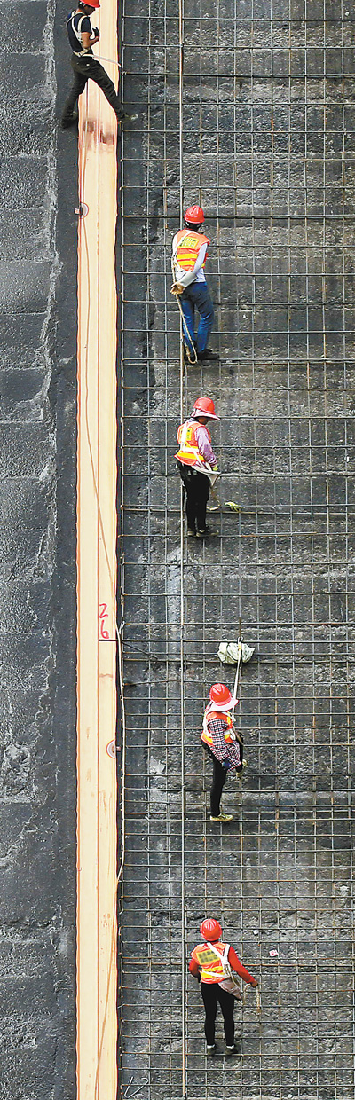 4月22日,浙江安吉,中國(guó)能建葛洲壩三峽建設(shè)公司承建的長(zhǎng)龍山抽水蓄能電站下庫(kù)大壩進(jìn)行鋼筋網(wǎng)綁扎。
