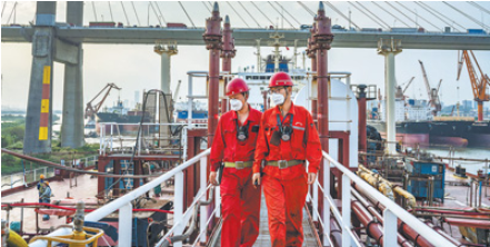 廣東中遠(yuǎn)海運(yùn)重工有序復(fù)工,原油裝載量超5萬(wàn)噸的瑞金潭輪??吭谥榻w龍山船塢檢修。圖為工作人員在船上檢查。