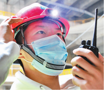 4月7日,上海虹口區(qū)一項(xiàng)目工地上,中建三局安監(jiān)人員通過(guò)“智能巡查安全帽”錄像照明功能巡查工地安全。