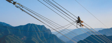 5月3日,國(guó)網(wǎng)四川電力送變電建設(shè)有限公司員工在秦嶺之巔的高空緊線。