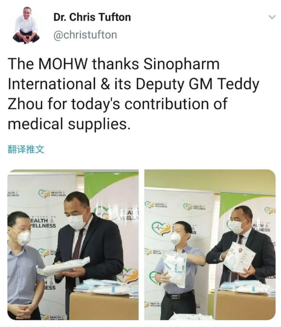 Christopher Tuften部長(zhǎng)高度贊揚(yáng)了國(guó)藥國(guó)際為牙買(mǎi)加醫(yī)療衛(wèi)生事業(yè)與牙買(mǎi)加人民健康作出的重大貢獻(xiàn),并代表牙買(mǎi)加人民向國(guó)藥國(guó)際表示衷心感謝。隨后,Christopher Tuften部長(zhǎng)在推特發(fā)布消息,再次代表牙買(mǎi)加衛(wèi)生部致謝國(guó)藥國(guó)際捐贈(zèng)抗疫醫(yī)療物資。