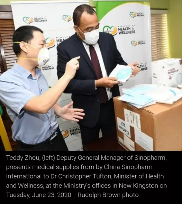 6月23日,國(guó)藥集團(tuán)中國(guó)國(guó)際醫(yī)藥衛(wèi)生有限公司(以下簡(jiǎn)稱(chēng)“國(guó)藥國(guó)際”)在牙買(mǎi)加金斯頓向牙買(mǎi)加衛(wèi)生部捐贈(zèng)了一批抗疫醫(yī)療物資,牙買(mǎi)加衛(wèi)生部部長(zhǎng)Christopher Tuften先生出席物資交接儀式。