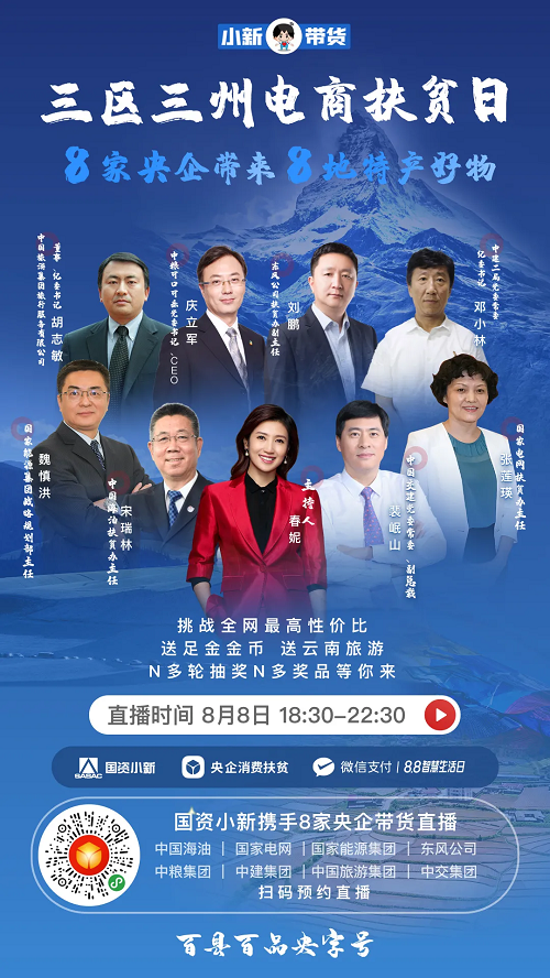 8家中央企業(yè)攜手定點扶貧的縣市亮相直播間,包括中國海油幫扶的甘肅甘南州合作市,國家電網幫扶的青海果洛州瑪多縣,國家能源集團幫扶的四川涼山州普格縣,中交集團幫扶的云南怒江傈僳族自治州、東風公司幫扶的西藏昌都地區(qū)貢覺縣,中糧集團幫扶的四川甘孜州石渠縣,中建集團幫扶的甘肅臨夏州康樂縣、卓尼縣、康縣和中國旅游集團幫扶的云南迪慶州香格里拉市。