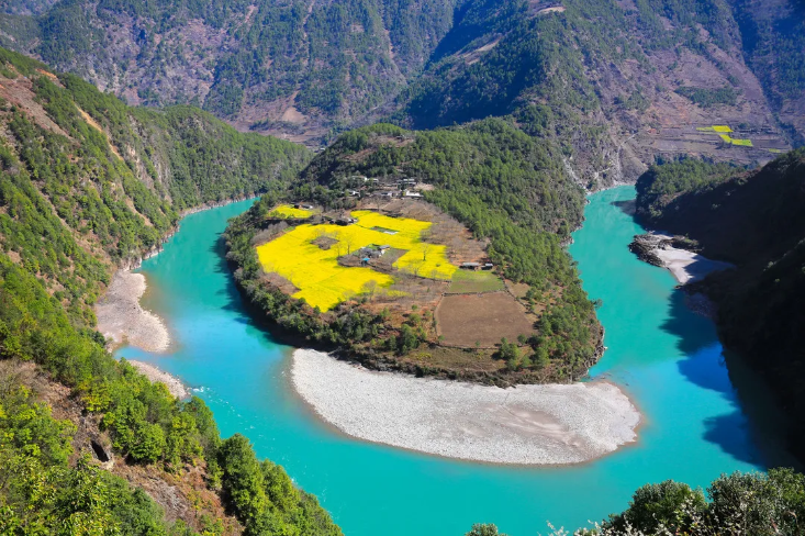 ▲ 怒江,流經云南貢山縣丙中洛鄉(xiāng)日丹村附近,由于王箐大懸?guī)r絕壁的阻隔,江水的流向從由北向南改為由東向西,流出300余米后,又被丹拉大山擋住去路,只好再次調頭由西向東急轉,在這里形成了一個半圓形大灣,稱為“怒江第一灣”。