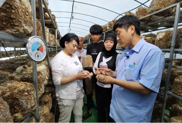 ▲中建二局甘肅省臨夏州康樂縣何溝村駐村書記牛軍帥,在香菇大棚內結對培訓。