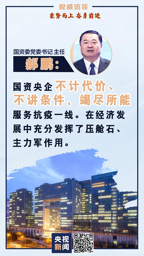 今年上半年,國(guó)資委和中央企業(yè)勇于擔(dān)當(dāng)、奮力拼搏,為統(tǒng)籌推進(jìn)疫情防控和經(jīng)濟(jì)社會(huì)發(fā)展作出了重要貢獻(xiàn)。6月份,央企收入和利潤(rùn)同步實(shí)現(xiàn)正增長(zhǎng)。下半年,中央企業(yè)干什么?怎么干?央視總臺(tái)記者對(duì)國(guó)資委黨委書記、主任郝鵬進(jìn)行專訪。