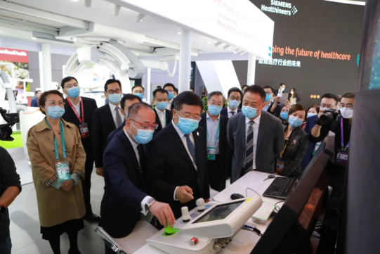 11月5日上午,國務院國資委任洪斌副主任在國藥集團董事長劉敬楨陪同下巡視第三屆進博會醫(yī)療器械及醫(yī)藥保健展區(qū)。