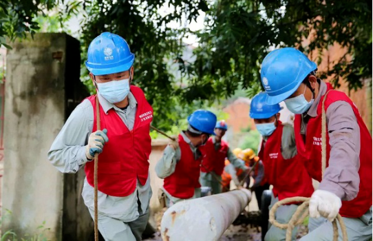 國(guó)網(wǎng)湖北鄂州華容供電公司共產(chǎn)黨員服務(wù)隊(duì)隊(duì)員在馬橋村五組低壓臺(tái)區(qū)改造現(xiàn)場(chǎng)奮戰(zhàn)。
