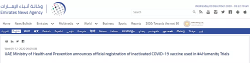 12月9日,據(jù)環(huán)球時(shí)報(bào)援引阿聯(lián)酋通訊社報(bào)道,該國(guó)衛(wèi)生和預(yù)防部今天宣布對(duì)國(guó)藥集團(tuán)中國(guó)生物北京生物制品研究所研發(fā)的新冠病毒滅活疫苗進(jìn)行注冊(cè)。這一決定是應(yīng)此前中國(guó)國(guó)藥集團(tuán)下屬的中國(guó)生物制藥有限公司(以下簡(jiǎn)稱“中國(guó)生物”)提出的申請(qǐng)而做出的。
