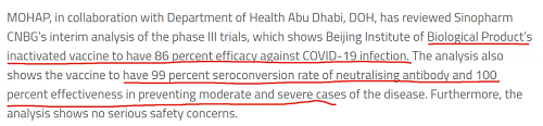 聲明稱,參與阿聯(lián)酋國(guó)際臨床(Ⅲ期)試驗(yàn)的3.1萬(wàn)志愿者來(lái)自125個(gè)國(guó)家和地區(qū)。試驗(yàn)分析顯示,該疫苗具有99%的中和抗體血清轉(zhuǎn)化率和100%預(yù)防中度和重度疾病的有效性,且無(wú)明顯副作用。而且相關(guān)研究沒(méi)有發(fā)現(xiàn)疫苗存在嚴(yán)重的安全隱患。