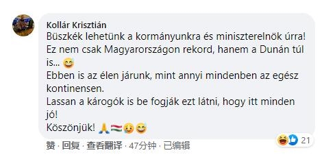 網(wǎng)民科拉爾表示:為我們的政府和總理感到驕傲!這不僅是匈牙利的紀(jì)錄,也是多瑙河以外的紀(jì)錄。在整個歐洲大陸,我們國家也在很多事情上領(lǐng)先。