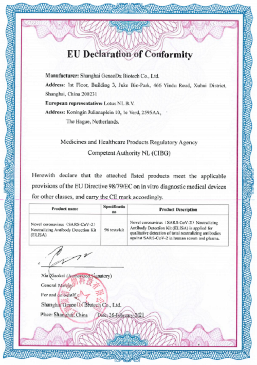 3月12日,國藥集團(tuán)中國生物上海捷諾生物科技有限公司(以下簡稱:中生捷諾)的新型冠狀病毒(SARS-CoV-2)中和抗體檢測試劑盒(酶聯(lián)免疫法)已完成了CIBG的CE認(rèn)證,使得其產(chǎn)品獲得了在歐盟以及其他認(rèn)可歐盟CE認(rèn)證國家的市場準(zhǔn)入。