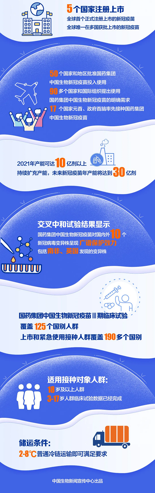 3月26日,國藥集團(tuán)中國生物北京生物制品研究所、武漢生物制品研究所兩款新冠疫苗累計供應(yīng)全球突破1億劑。截至目前,已有50個國家和地區(qū)批準(zhǔn)國藥集團(tuán)中國生物新冠疫苗注冊上市或緊急使用,接種超過8000萬劑,接種人群覆蓋190多個國別,得到國際社會廣泛認(rèn)可與高度贊譽(yù)。