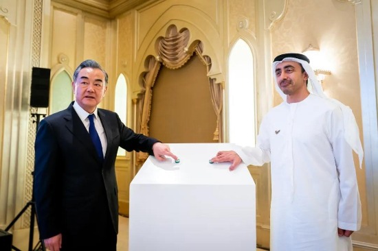 中國國務(wù)委員兼外交部長王毅、阿聯(lián)酋內(nèi)閣部長兼外交與國際合作部長謝赫·阿卜杜拉·本·扎耶德·阿勒納哈揚在阿聯(lián)酋阿布扎比儀式現(xiàn)場,啟動并連線國藥集團中國生物與G42集團合作新冠疫苗原液灌裝生產(chǎn)車間,共同見證阿聯(lián)酋與阿拉伯地區(qū)首批新冠滅活疫苗正式分裝下線,并與新冠疫苗模型合影。