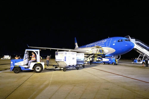 4月1日,工作人員在阿根廷布宜諾斯艾利斯埃塞薩國際機(jī)場(chǎng)卸載運(yùn)抵的中國新冠疫苗。新華社發(fā)