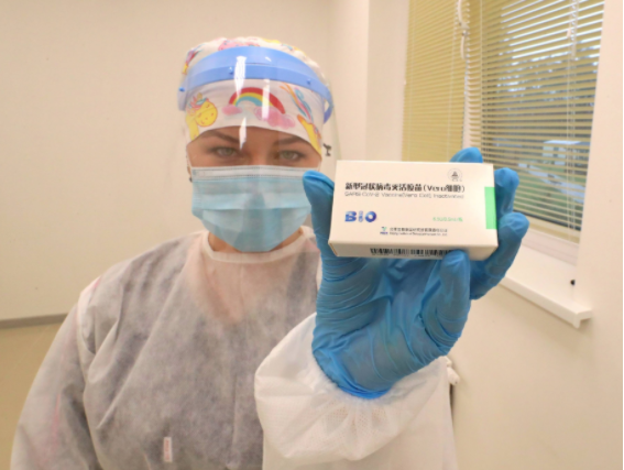4月16日,在白俄羅斯首都明斯克郊區(qū)的中白工業(yè)園,醫(yī)務人員展示中國國藥集團研制和生產(chǎn)的新冠滅活疫苗。