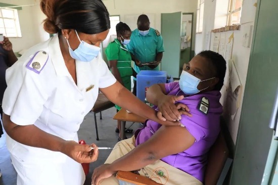 2月22日,醫(yī)務(wù)工作者在津巴布韋中部省戈奎的醫(yī)院內(nèi)為當(dāng)?shù)鼐用窠臃N中國國藥集團(tuán)新冠疫苗。新華社發(fā)(萬達(dá)攝)